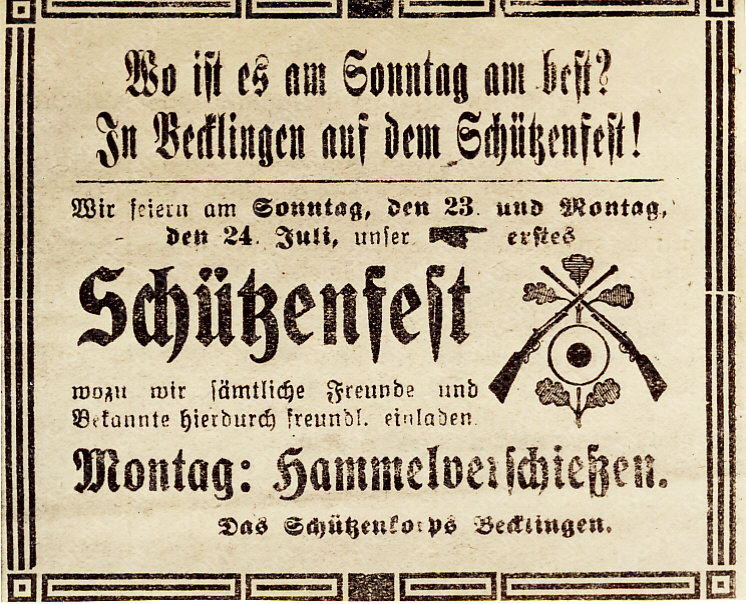 „Die Schützenfeste nehmen ihren Anfang. In Becklingen wird Sonntag und Montag und in Hassel Sonnabend und Sonntag gefeiert. In Verbindung mit den beiden Schützenfesten findet Preisschießen statt.“