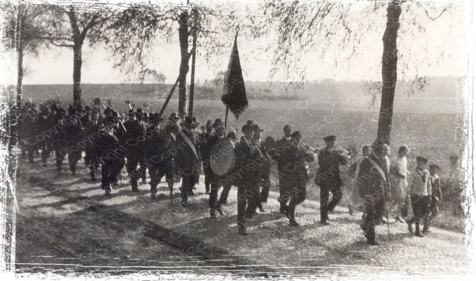 Der Rückmarsch des Schützenvereins führte damals in Höhe von Rehrmanns auf der Reichsstraße 3 (heute „Alte Straße“), die noch mit sog. Napoleonpflaster belegt war, entlang. Vorneweg marschierte der Kommandeur Heinrich Rodehorst, ausgestattet mit den Insignien seiner Würde, Schulterschärpe und Säbel. Dahinter marschierte die Kapelle "De Winser" mit 6 Musikern. Aus den Gewehrläufen der Schützen ragte der Blumenschmuck als Zeichen der Friedfertigkeit.