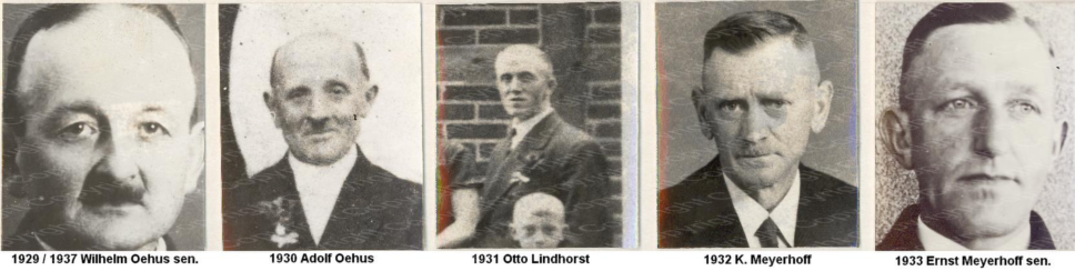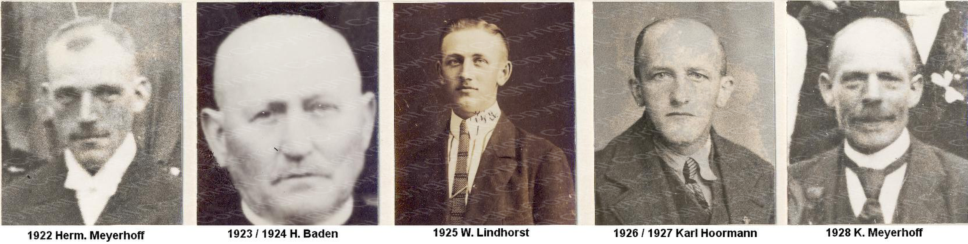 Desweiteren ist bekannt, daß Heinrich Baden, Haus-Nr. 3 (Hinz Baden), zum Vor-stand gehörte. Das 6. Vorstandsmitglied läßt sich für 1924 nicht eindeutig nachwei-sen, nach Befragung älterer Mitglieder war es Karl Meyerhoff, Haus-Nr. 7 (Grauns), der sich ab 1925/26 bis 1939 nachweisen läßt. Es kann davon ausgegangen werden, daß dieser Vorstand, obwohl keine schriftlichen Aufzeichnungen vorliegen, seit der Gründung 1922 bestanden hat. Aus den Aufzeichnungen geht weiter hervor, daß Wilhelm (Willi) Helmke, Haus-Nr. 2a (Lohmanns), Vereinsbote war und für diese Tätigkeit beitragsfrei geführt wurde.